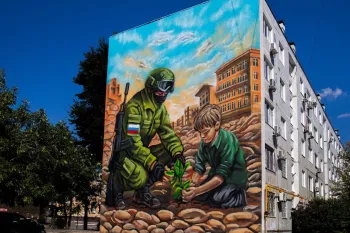 В своем граффити художник мастерски передал идею преемственности поколений: солдат и ребенок сажают молодое дерево как символ мира и новой жизни на улице освобожденного города.